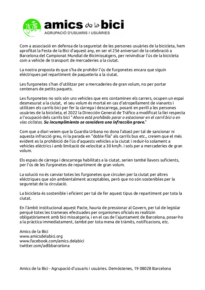 Com a associació en defensa de la seguretat de les persones usuàries de la bicicleta, hem aprofitat la Festa de la Bici d'aquest any, en ser el 25è aniversari de la celebració a Barcelona del Campionat Mundial de Bicimissatgers, per reivindicar l'ús de la bicicleta com a vehicle de transport de mercaderies a la ciutat.
